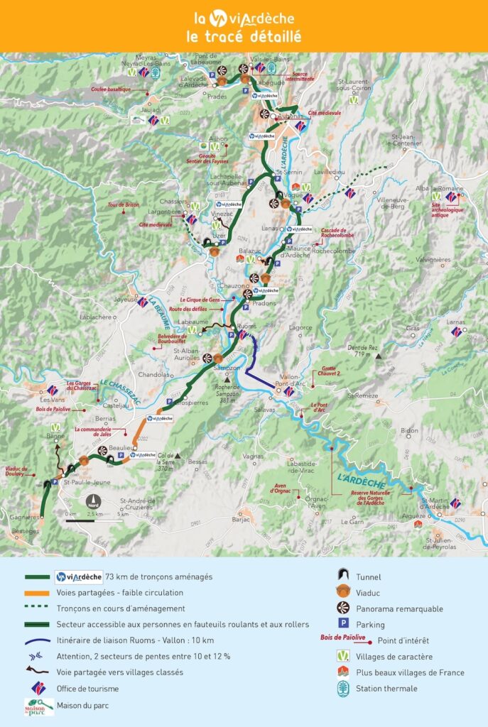 La Via Ardèche, c’est plus de 24 km de piste cyclable sécurisée aménagée sur une ancienne voie ferrée. De Vogüé à Grospierres, en passant par Saint-Sernin et Ruoms, pédalez en toute sérénité à travers tunnels illuminés, viaducs panoramiques et villages de caractère.
